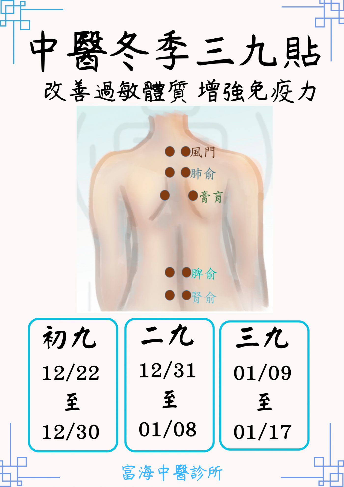 坊間我們常聽到中醫三伏天,但您是否有聽過三九天呢? 三九天又被稱為三九貼,是一種自古流傳下來的中醫療法。古代中醫典籍《黃帝內經》中闡述了「冬不藏精、春必病溫」這樣一種疾病預防的觀念,提示了我們倘若能在一年當中最為寒冷的冬季時節調養好體質,來年便能免於疾病的侵擾,而中醫所謂冬季「三九天」便是以此為基礎,結合中醫傳統人體經絡理論與中藥配伍思維而成的一種治療模式,希望藉此發揮改善自身體質、提高免疫力以達到預防各類疾病的效果。