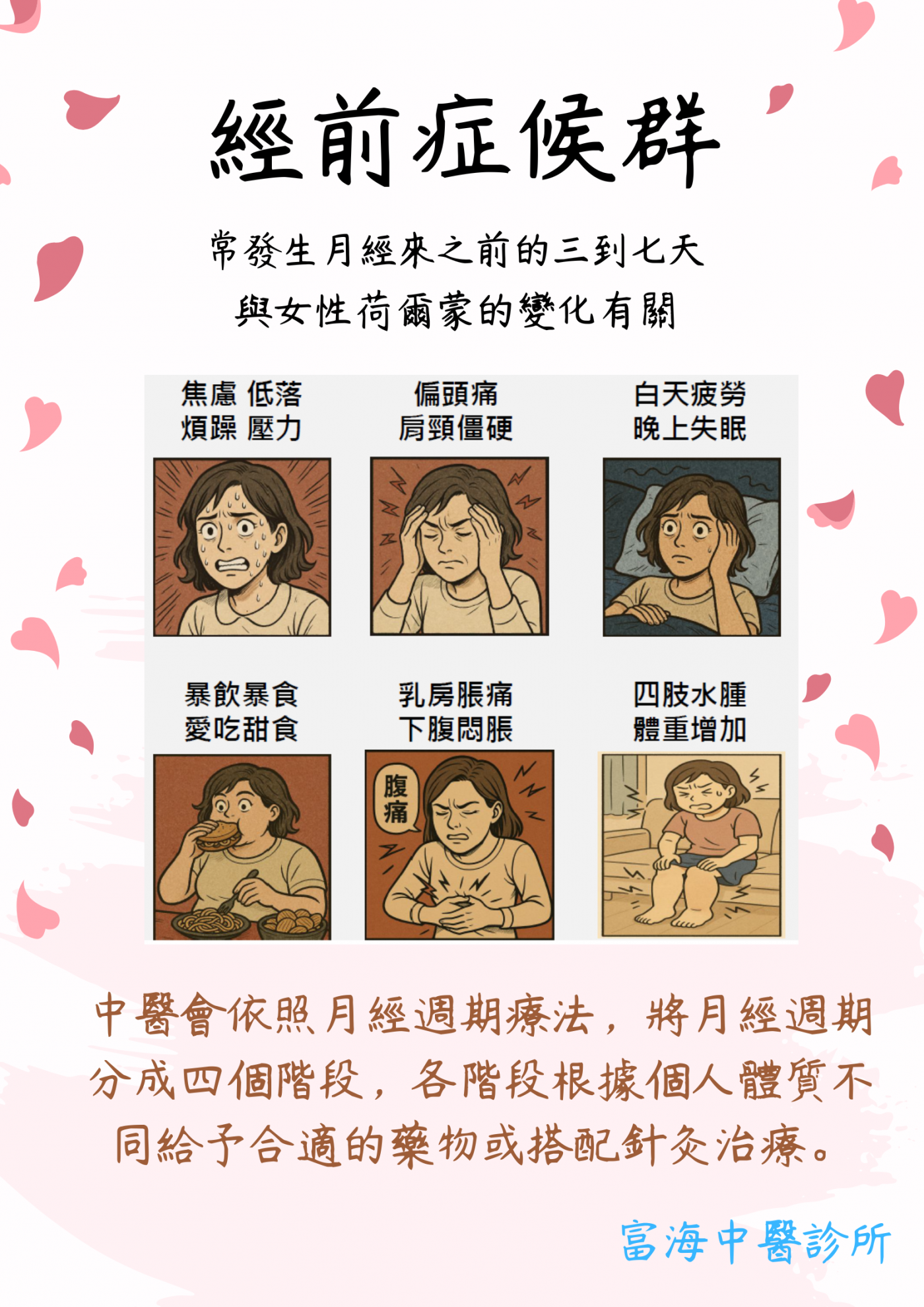 經前症候群指在月經來之前的三到七天,出現以下症狀 通常這些症狀會在月經來之後改善,但也有少數會持續整個經期。 現代醫學指出此一現象可能跟女性每個月荷爾蒙的改變有關。